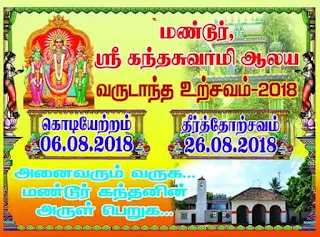 ( மண்டூர் நிருபர்)கிழக்கிலங்கையின் வரலாற்றுச் சிறப்புமிக்க மட்டக்களப்பு மண்டூர் ஸ்ரீ கந்தசுவாமி ஆலய வருடாந்த உற்சவம் எதிர்வரும் 06.08.2018(திங்கட் கிழமை) அன்று கொடியேற்றத்துடன் ஆரம்பமாகவுள்ளது. தொடர்ந்து இருபது நாட்கள் சிறப்புத் திருவிழாக்கள் இடம்பெறுவதுடன் 21ம் நாளான 26.08.2018 அன்று ஞாயிற்றுக் கிழமை தீர்த்தோற்சவம் இடம்பெறும்.