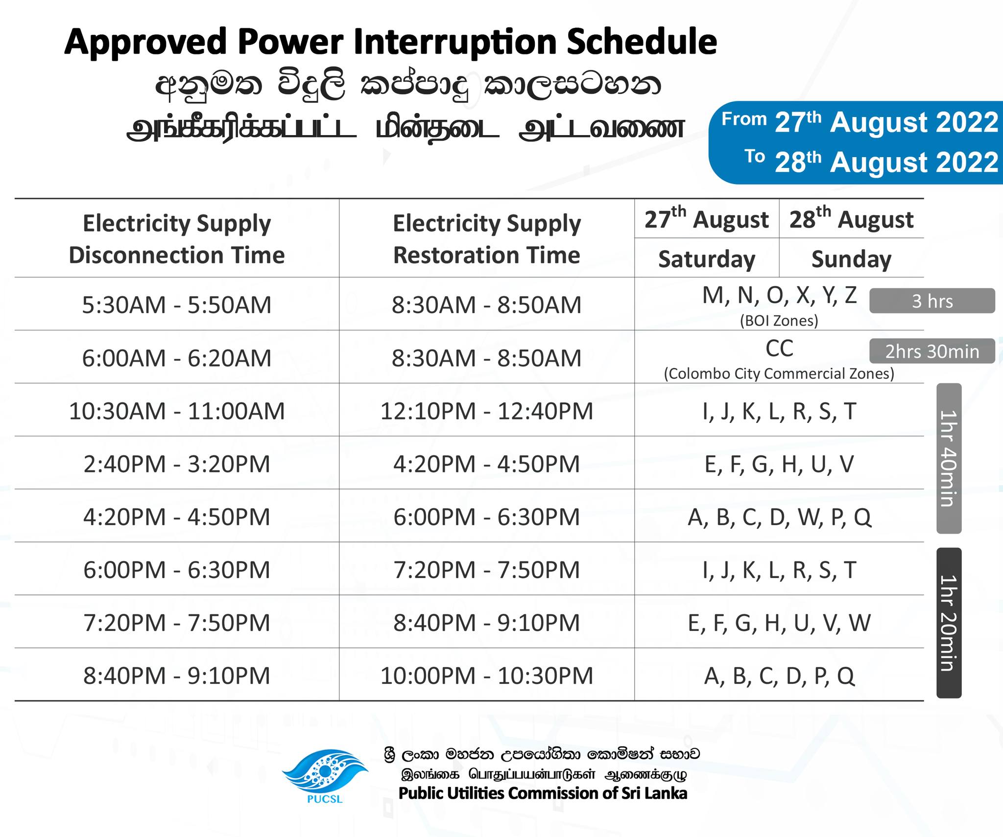 இன்று (27) சனிக்கிழமை 03 மணித்தியாலங்களுக்கு மின்வெட்டை அமுல்படுத்துவதற்கு பொது பயன்பாடுகள் ஆணைக்குழு அனுமதி வழங்கியுள்ளது.